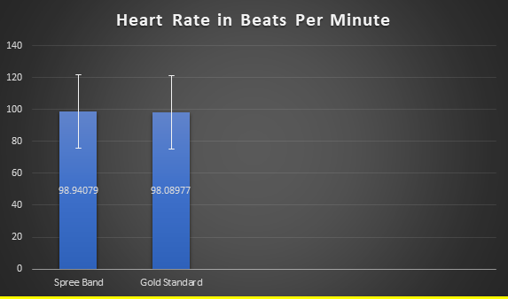 Mean for Heart RateGold Standard: 98.08977 Beats Per Minute Spree Band: 98.94079 Beats Per Minute