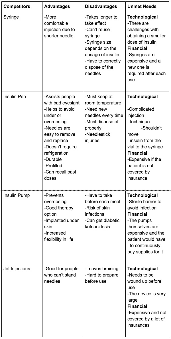 An existing patent related to our model insulin patch is that of the transdermal patch. The patent is for a patch consisting of four layers including a protective, adhesive, matrix and cover layer. The inventors of the patch, John LeDonne of New Jersey and Claudia Meyer of Delaware, filed the patent on January 8, 2015 and it was later published on July 14, 2016. The main claim of the patent states, “The cover layer is at least partially bi-elastic, and the adhesive layer comprises an acrylic copolymer having hydroxyl functional groups. The matrix layer comprises a physiologically effective amount of buprenorphine or pharmaceutically acceptable salts thereof.”1
