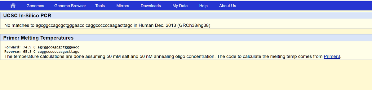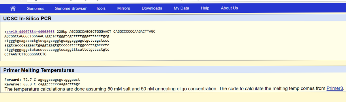 The results of the primer test showed that the non-disease primers targeted DNA fragment of chromosome 19:44907834 to 19:44908053, and the primer melting temperatures as well. For the non-disease forward primer, the melting temperature was 72.7 degrees Celsius, and for the non-disease reverse primer, the melting temperature was 65.3 degrees Celsius. The results of the primer test also showed that there were no matches for the disease specific primers that the group designed, as expected.