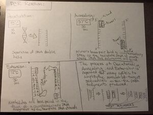 There will be a couple of components used during the PCR Reaction. Each one of these components has a specific purpose in the reaction process. The first component is template DNA is the original DNA which is used to produce the desired complementary DNA fragments that will be amplified in the PCR reaction. The next components are primers, which are the short segments of DNA added that provide a starting point for where replication is supposed to occur by binding to the template DNA at the specific complementary matches, marking where the Taq Polymerase are supposed to work. Then, Taq Polymerase is necessary as the enzyme that takes nucleotides and links them together in the correct sequence to create complementary DNA fragments to the template DNA. Finally, dNTPs (deoxyribonucleotides) are the nucleotides and bare materials that make up the DNA and are used by the Taq Polymerase to create the DNA fragments.