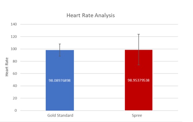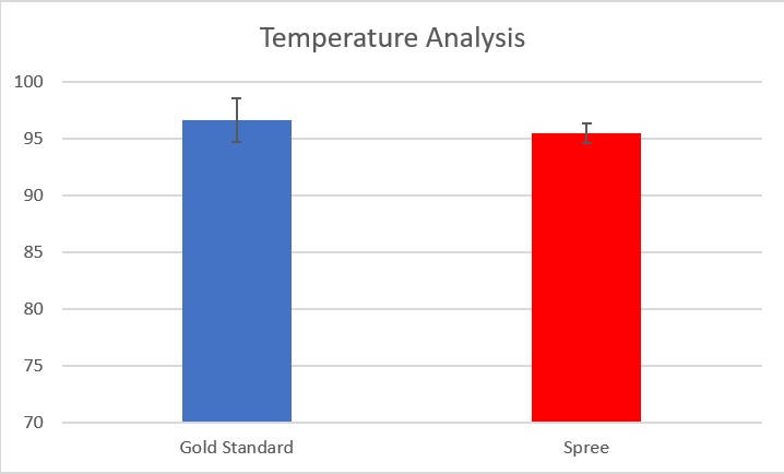 Design Flaws and RecommendationsOver the course of this experiment many conclusions were made. The recorded measurements from the Spree Band were fairly close but not as precise as the values for the gold standards of each measurement. The means of the Spree Band and the gold standard for both temperature and heart rate were within 1.1 degrees and 1.0 beats per minute respectively. The standard deviations of the Spree Band and the gold standard for the temperature were 0.8703782993 and 1.922602071 respectively. Additionally, the standard deviations of the Spree Band and the gold standard for the heart rate were 24.87753802 and 9.899494937 respectively. These values show that when measuring temperature, the Spree Band is more reliable than when measuring heart rate however, neither match up completely to the gold standard. The Pearson’s correlation coefficient for temperature was 0.1927980889 while the coefficient for heart rate was 0.6908064894. Since both of these values did not closely approach +1 yet were still positive numbers, they showed a positive relationship between the two variables, but not a perfect linear relationship. Therefore, the Spree Band can be utilized to measure temperature and heart rate but its effectiveness is questionable when compared to the measurements of the gold standard.