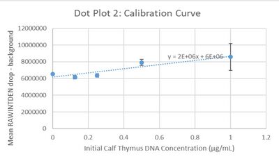 The first image, Calibration Curve 1, shows the graph of the Mean RAWINTDEN drop plotted against the Initial Calf Thymus DNA Concentration.