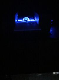 8. Align the drop by moving the slide so that the blue LED light is focused by the drop to the middle of the black fiber optic fitting on the other side of the drop.