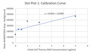 | Initial Concentration of 2X Calf Thymus DNA solution (micrograms/mL) | Final DNA concentration in SYBR Green I solution (µg/mL) | Sample Number | RAWINTDEN DROP - BACKGROUND |  |  | MEAN | Standard Deviation |