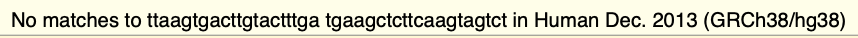 When inputting the disease forward primer 5’-TTAAGTGACTTGTACTTTGA-3’ and the disease reverse primer 5’-TGAAGCTCTTCAAGTAGTCT-3’ into the UCSC In-Silico PCR webpage, no results were returned.