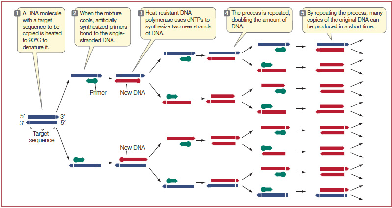 The Polymerase Chain reaction has several components that each have a unique function. Template DNA is the region of DNA that will be amplified by the PCR process. In order to begin the multiplication of the Template DNA, two different primers need to be added to the reaction. Both primers are short sequences of nucleotide with opposite configurations that begin the creation of new DNA from opposite ends of the Template DNA strand. The actual replication of the DNA is carried out by a polymerase enzyme found in thermophilic bacteria, Thermus aquaticus, namely called Taq Polymerase. Taq Polymerase adds free deoxyribonucleotides, which are individual base units of DNA, to the Template DNA strands to create two copies of the original DNA.