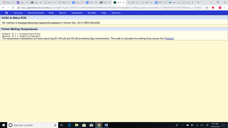 The primer test helps us detect a disease-associated DNA sequence. By locating the position of the disease-associated allele and its codon, both non-disease/disease, forward/reverse primers were created and tested in the UCSC In‐Silico PCR website. The results are shown below: