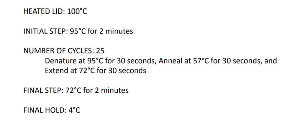 Thermal cycling happens in a set of six general steps. The Initial Step consists of the DNA Template being heated to 95°C for 2 minutes. This is the time when the DNA is heated to begin the process of PCR. Following this is the Denaturization at 95°C, still, for 30 seconds. What happens is the DNA's double strand gets separated into single strands. The next step is Annealing at 57°C for 30 seconds. This annealing allows for the primers to attach to the single-stranded DNA templates. Two primers are added, one for each single-strand, to its designated, complimentary match on the target DNA sequence. They do this in order to be able to be copied later. Extension occurs next at 72°C for 2 minutes. At this point, the enzyme, Taq Polymerase, makes an appearance. It binds to the prime sequence and adds free dNTP's to their correct complement in the 5'-3' direction to extend the strand. Second, to last, the Final elongation happens at 72°C, again, for 2 minutes. This ensures that the previous events happened and make sure any single-stranded DNA is completely elongated. In the final step, the final hold, the reaction is cooled to 4°C so that the cycle stops and no more unnecessary replications are made.