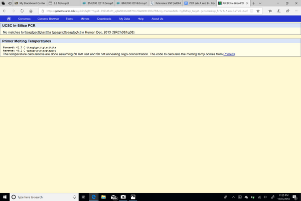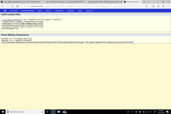 SNP Information & Primer DesignBackground: About the Disease SNP SNP is single nucleotide polymorphism. A nucleotide is the basic structural unit and building block for DNA. There are four nucleotides which are Adenine, Guanine, Cytosine, Thymine. A polymorphism is two or more clearly different morphs or forms, also referred to as alternative phenotypes, in the population of a species. A variation of SNP, rs721710, is found in Homo Sapiens. It is located on chromosome 12:40315266. There is no clear clinical significance of this SNP, but it has been linked to Parkinson's disease. LRRK2 stands for leucine-rich repeat kinase 2. The functions of LRRK2 include ATP-Binding, GTP-Binding, and GTP-binding depnedent-protein kinase activity. An allele is an alternate form of a gene that arises from a mutation and is found in the same place on a chromosome. The disease-associated allele contains the codon GAG. The numerical position of the SNP is 40315266. Primer Design and Testing The non-disease forward primer (20nt) is 5' T T A A G T G A C T T G T A C T T T G T 3'. The numerical position exactly 200 bases to the right of the disease SNP is 40315466. The non-disease reverse primer is 5' T G A A G C T C T T C A A G T A G T C T 3'. The disease forward primer is 5' T T A A G T G A C T T G T A C T T T T A 3'. The disease reverse primer is 5' T G A A G C T C T T C A A G T A G T C T 3'. When using the UCSC In-Silico PCR website, we found that the non-disease forward primer and the non-disease reverse primer had a 220 bp. From this we can conclude that there weren't any issues or mutations in the sequence. In the disease forward primer and the reverse primer there was no match. From this we could assume that there was a possible mutation.
