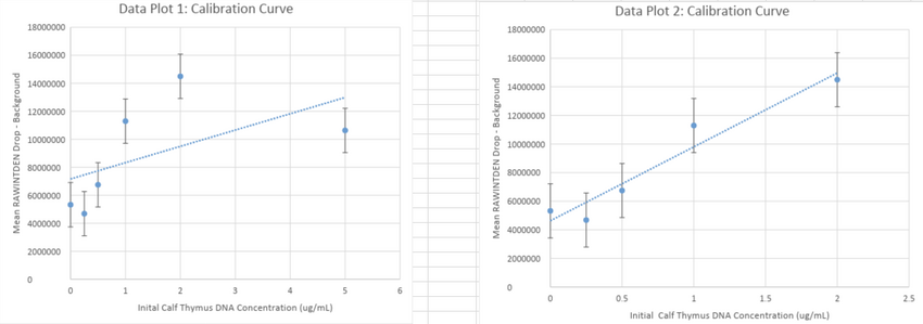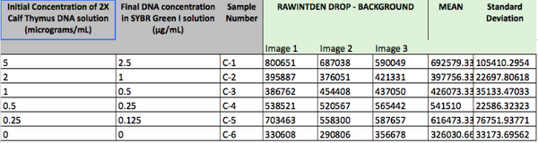 First, since the drops needed to be 160 microliters and contained two different substances, the micropipette was set to 80 microliters. Second, 80 microliters of SYBR GREEN was obtained and in the micropipette. Third, the drop of SYBR GREEN was placed by very slowly releasing the micropipette into the first hole on the glass slide and as the drop became larger, dragging the drop to the second hole. The drop was spanning the two holes. Fourth, 80 microliters were obtained of the substance being tested with a new, clean micropipette tip. Fifth, the tip of the micropipette was slightly stuck into the drop and the plunger was slowly released to add the substance to the drop. The fluorimeter was then ready for pictures. Once the pictures were taken, the liquid was sucked up by the micropipette and disposed of in the waste container. The next two holes on the glass slide were used for the next drop.