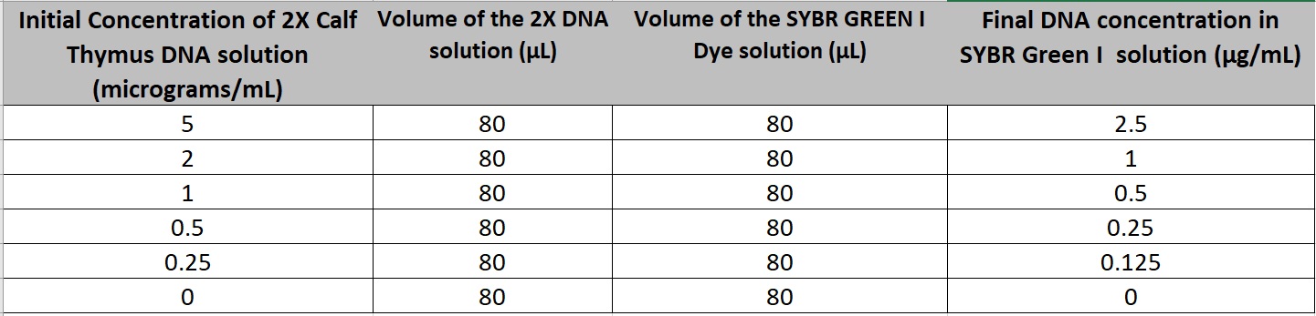 - Take an 80 microliter solution of SYBER GREEN 1 and place it in the middle of the first two rows of the slide using the pipettor. Add an 80 microliter solution of one of calf thymus solutions listed as follows: 0, 0.25, 0.5, 1, 2, and 5. This