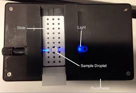 Once you turn the fluorimeter on and place it on the table you put the glass slide on smooth side down. Next set up the camera in the cradle so you are looking level at the slide, you might need to adjust the height. Turn your photo app on to be ready to take pictures. Next place 80 uL drop of