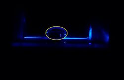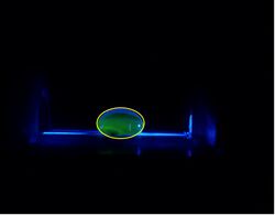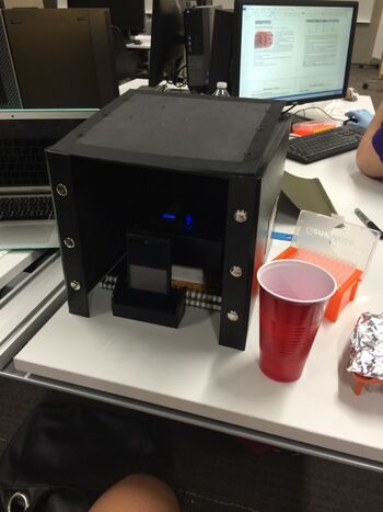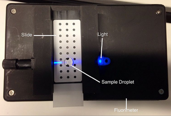 A flourimeter uses optical caustics in applied to flourescence to observe and measure the amount of flourescence. Flourescence can occur when a wavelength excites a molecule causing the emission of light. In this experiment, the SYBR Green when attached to the DNA nucleotides should glow when placed on the Flourimeter. Optical caustics causes light to be concentrated near the surface of the drop in order to increase the intensity of the flourescence. This is what can be eventually captured by our cell phones. The flourimeter is made of generic plastic, and a drop is placed on a special type of slides with a rough surface with a micropipette. Once aligned, a blue light is shown through the drop causing the SYBR Green to flouresce and an image to be captured on a cell phone to later be recorded on the computer program ImageJ. How the Fluorescence Technique Works First, the flourimeter is set up by turning on the Blue LED and turning on and putting a smart phone on a cradle in front of the flourimeter. From this position, adjust the flourimeter to the height of the cell phone's camera in order to get a picture of the drop sideways and not from any other angle. This can be done by placing books or other materials underneath the flourimeter. After placing the drop of SYBR Green on the slide and adding the DNA to the dye, the dye will bind to the nucletide in the DNA. So, when the SYBR Green is exposed to the blue light, it will start to flouresce, putting a dark container over the reaction will make the flourescence easier to see in the picture taken by your cell phone.