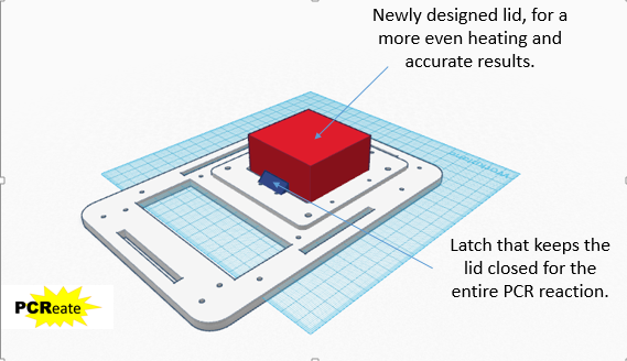 PCReate identified the main problem with the OpenPCR machine had to do with the heating system. When put together correctly, the machinery inside worked fine. What we found to be the problem was the heating system to conduct the PCR reaction. On top of the OpenPCR machine is a box, that contains the heating plates and a spot to place test tubes. We wanted to keep the same size and number of test tubes inside the heating compartment, however we wanted to get rid of the "tightening system" that lowers the top heating plate over the top of the test tubes once the lid is closed. In order to get the most accurate reaction, this top heating plate must be aligned perfectly. Being human, this is not garunteed to happen. The person who conducts the experiment either tightens the plate of the OpenPCR machine too tight and pops open the lid, or the heating place is too far away from the test tubes and they don't heat throughly. With the PCReate system, we have designed the lid of the OpenPCR machine to be already adjusted to the generic test tube size given to you as a consumable with an order of the PCReate OpenPCR system. This garuntees and even reaction throughout the entire test tubes and eliminates chances for error. Flourimeter Modifications PCReate did not modify the design to the basic cell phone flourimeter, but plan to in the near future. For now, the basic flourimeter is given to the consumer with clear and concise instructions.