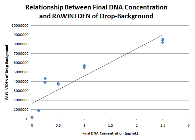 How the Fluorescence Technique WorksFluorescence is a very sensitive detection technique. A beam of light shines through the drop at a certain wavelength and excites the electrons in molecules of the drop causing it to emit a light of a longer wavelength. The slide we are using is coated with a rough layer of Teflon but has circles of bare glass. This combination of properties results in a superhydrophobic surface that allows the solution to cling to the glass but repel from the layer of Teflon. The environment from the slide allows the blue LED light to focus on the drop and thus increases the intensity of the fluorescence event. The combination of the SYBR Green Dye I and the solution form a complex with the DNA that prefers to go to the surface creating the beach ball shaped drop on the slide. This specific material creates the perfect environment to then measure the fluorescence of the sample. In this particular experiment, we use ImageJ software to measure and analyze the degree at which the fluorescence is emitted from the sample to understand the components of the DNA sample.