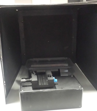 A black box device used to measure florescence parameters and patterns. Using the 2 blue LED lights, the Single-Drop Fluorimeter beams through a sample to record data. The data is than converted into an electrical signal and transmitted to a computer