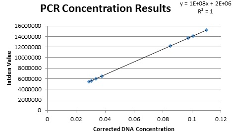 | PCR Product TUBE LABEL | AVERAGE INTDENS VALUE | PCR Product Concentration, µg /mL | Corrected PCR Product Concentration, µg /mL |