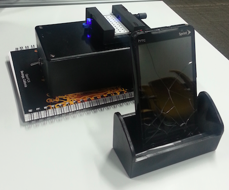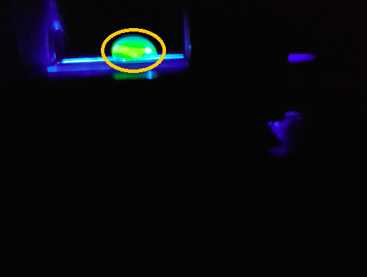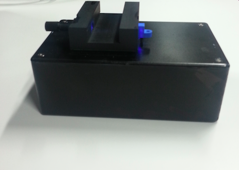 The SYBR green dye works best with double stranded DNA however, it has been shown to stain single stranded DNA and in some cases even RNA. This single drop fluorimeter is a box that covers a black stand that can hold a bubble of solution.