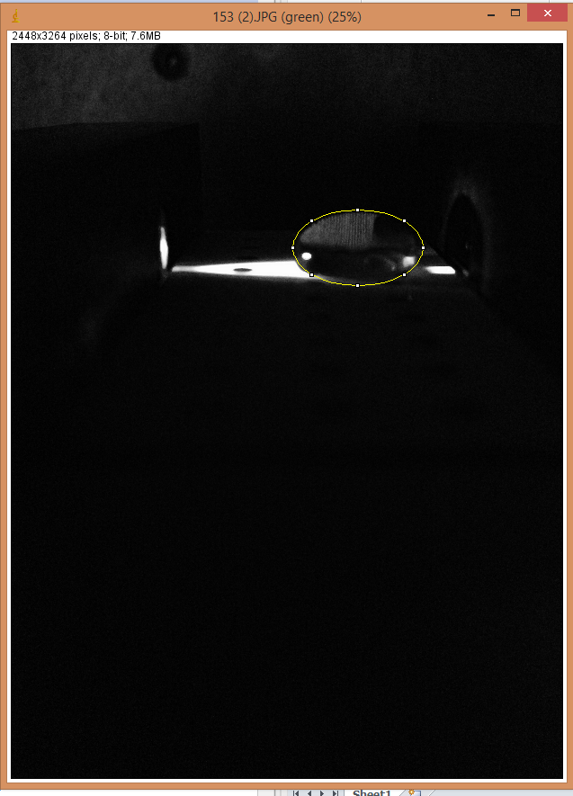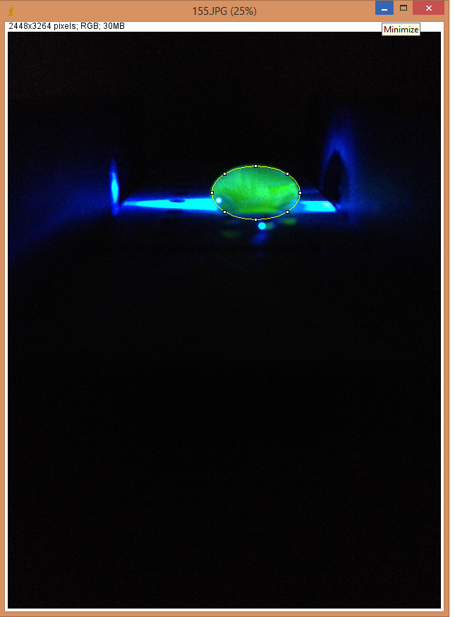 The camera was set on a cradle eye level with the sample. We set the camera with a timer so there would be no other light than the LED light the green glow coming from the sample. We clicked the button and closed the flap of the outer black case, then the camera took the picture of the sample.