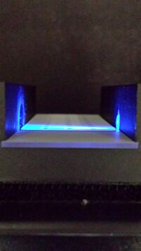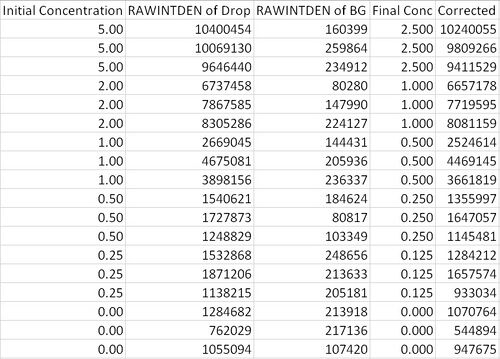 This technique measures the concentration of DNA by adding a fluorescent dye and measuring the amount of fluorescence. We do this by using a single-drop fluorimeter. We put on a glass slide on the rough side and then put it in a light sensitive box. We set up the camera so it was looking at the slide horizontally and then set the timer for 3 seconds. Drops of SYBR Green are placed on the glass circles along with the DNA samples. Blue LED light from the fluorometer illuminates the drop this than causes the dye to fluoresce. The image that is taken is then analyzed to determine the concentration of DNA is in the solution.