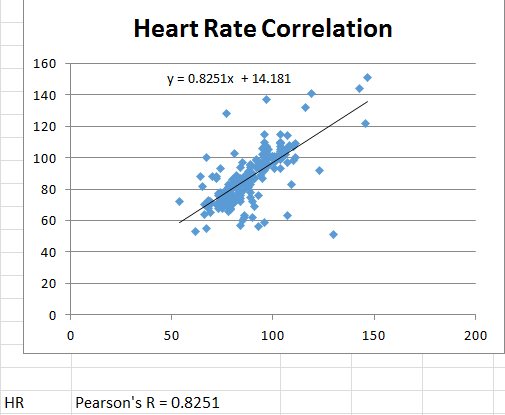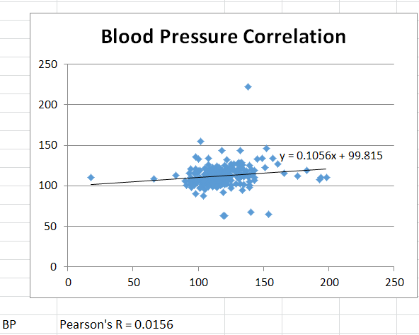 AnalysisFor each of the quantities measured (diastolic blood pressure, heart rate, and body temperature) a separate t-test was used to compare the results between the experimental devices and the gold standards (2 sources of data). It was a paired t-test because the devices were tested on individuals simultaneously as opposed to having different groups testing each device alone. T-Tests: In analyzing the results of the temperature devices' t-test, the p value was calculated to be 2.7*10^-6. This value is much less than 0.05 indicating the results are statistically significant. The data from the blood pressure devices resulted in a p value of 2.97*10^-5, which also confirms statistical significance. However, the p value for the heart rate devices was calculated to be 0.1198, which is larger than 0.05 and indicates results that are not statistically significant. Pearson's R: The Pearson's R of the blood pressure devices resulted in R = 0.1056 which is almost no correlation whatsoever. The Pearson's R of the heart rate devices, on the other hand, was calculated to be R = 0.8251 which indicates a relative amount of correlation but not extremely high.
