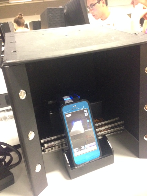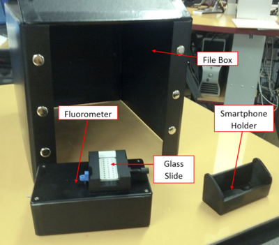 Place the smart phone on the cradle at a right angle from the slide. Adjust the height of the fluorimeter using the plastic trays so that the camera takes a picture of the sample drop sideways.