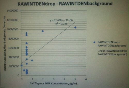 Eight PCR reactions were completed in previous lab. This lab used the SYBR Green I and imaging technique to clearly see the amount of amplified DNA in each reaction. A standard curve converted the INTDEN values to DNA concentration. The threshhold values were measured by the controls of the positive and negative PCR reactions to determine if the two patients in this experiment were positive or negative. Positive control : PCR result 2,428,578 μg/mL Negative control : PCR result 935,166 μg/mL Patient 80926 : A basic clear shiny drop : Recordings were 325,798 μg/mL, 259,300 μg/mL, and 734,163μg/mL. These numbers are smaller compared to the positive control value and closer in comparison to the negative control. This concludes that the first patient had a negative test result. Patient 83588 : A bright green fluid drop : Recordings were 3,717,326 μg/mL, 3,488,620 μg/mL, and 2,897,463 μg/mL. These numbers are larger in comparison to the negative control value and closer in comparison to the positive control value. This concludes that the second patient had a positive test result.