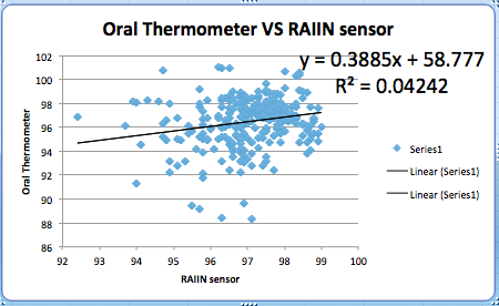 According to the results of the T-Test, the P-value ended up being much smaller than .05. This indicates that there is a statistical difference in the data which is expected because the correlation is so low. This shows how much difference there is in the two devices. Since the Pearson's R value is greater than 0 there is technically a very slight positive correlation, however since the value is so close to zero, this is not an extremely reliable result. The RAIIN sensor had a few flaws that we considered to be substantial; these included frequent disconnection, lower temperature readings, failure to reboot, and time needed to give consistent results. The device would benefit from improved bluetooth connection, sensor accuracy, user friendliness, and feedback on the device status.