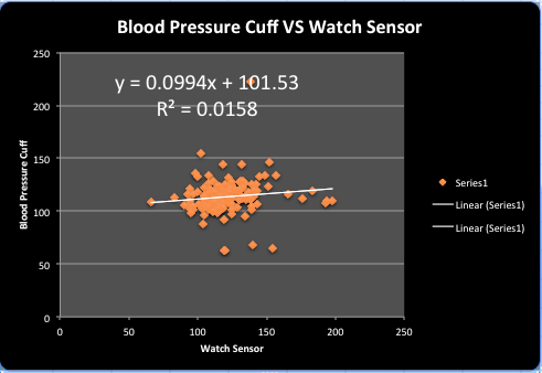 According to the results of the T-Test, the P-value ended up being much smaller than .05. This indicates that there is a statistical difference in the data which is expected because the correlation is so low. This shows how much difference there is in the two devices. Since the Pearson's R value is greater than 0 there is technically a very slight positive correlation, however since the value is so close to zero, this is not an extremely reliable result. Some problems with the Omcron watch sensor were that since it is measuring the blood pressure so far from the heart, it won't be a very accurate reading. The watch sensor also failed to work many times unless it was placed perfectly over the subjects chest. One design recommendation would be to have the watch sensor take the reading from the upper arm. This is closer to the heart and there will be a stronger pulse, this is also where the blood pressure cuff takes the reading which may add accuracy.