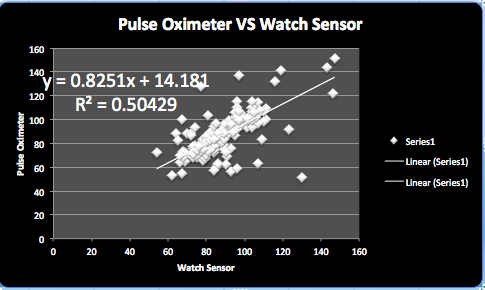 The results of the T-Test shows that there is some correlation in the data. The Pearson's R value is right at .5 which indicates that there is a positive correlation between the Omcron watch sensor and the pulse oximeter. Therefore we can conclude that the Omcron sensor is reasonably accurate at measuring the pulse oxygen levels, however it is not accurate at measuring the blood pressure. If the watch sensor was placed on the upper arm as previously suggested, the pulse ox reading would be even more accurate.