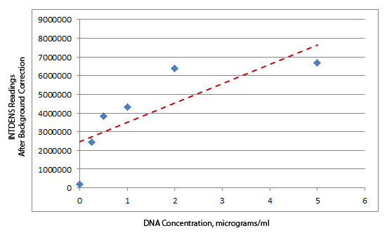 | Initial Concentration of 2X Calf Thymus DNA solution (micrograms/mL) | Volume of the 2X DNA solution (μL) | Volume of the SYBR GREEN I Dye solution (μL) | Final DNA concentration in SYBR Green I solution (μg/mL) |