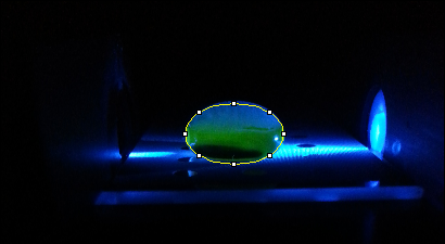 First turn on the Blue LED switch in order to activate the excitation light. Also make sure the camera is open with the settings listed above. From there place the pone on the cradle with 90 degree angle from the slide. Make sure to adjust the height of phone and/or fluorimeter in order to take pictures of the drops. Lastly, the cradle should be as close to the fluorimeter as possible with having a clear picture still.