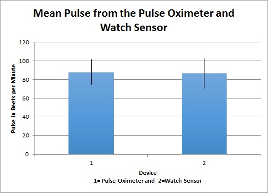 Pulse StatisticsPulse Oximeter: mean value:87.857 beats/min standard deviation:13.795 beats/min Watch Sensor: mean value:86.734 beats/min standard deviation:16.120 beats/min