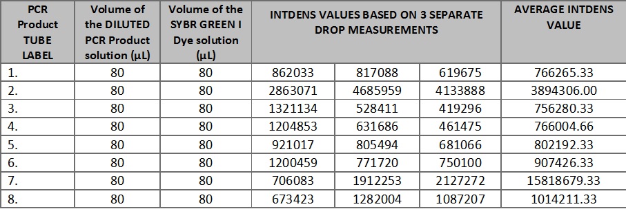 Data AnalysisRepresentative Images of Samples [Instructions: Show an IMAGE where you drew a circle around the droplet with the freehand tool for a sample with no DNA] http://openwetware.org/images/9/99/Screen_Shot_2014-04-16_at_6.35.05_AM.png [Instructions: Show an IMAGE where you drew a circle around the droplet with the freehand tool for a sample with DNA (positive signal)] http://openwetware.org/images/8/84/Screen_Shot_2014-04-16_at_6.34.53_AM.png Image J Values for All Samples [Instructions: See worksheet page 8. To save time on typing a new Wiki table from scratch, use THIS TOOL to auto-generate a Wiki table: Excel-to-Wiki Converter. Copy the headers and values from the Excel spreadsheet you made, paste them into the form field, click submit, copy the Wiki code that the tool generated, and replace TABLE GOES HERE (below) with your auto-generated code.]