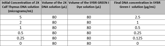 | PCR Product TUBE LABEL | Volume of the DILUTED PCR Product solution (µL) | Volume of the SYBR GREEN I Dye solution (µL) | INTDENS VALUES BASED ON 3 SEPARATE DROP MEASUREMENTS | ' | ' | AVERAGE INTDENS VALUE |