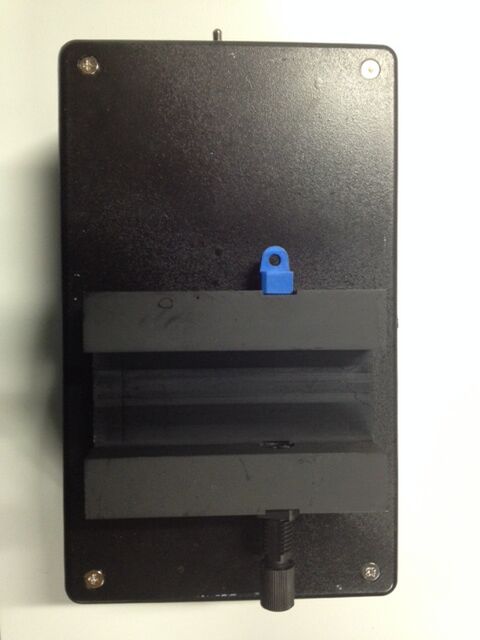 The single-drop fluorimeter is a black box with a cradle on top for the glass slide that will have a drop on it. Towards the front of the cradle there is a blue LED light that can be toggled on or off with a switch. Image 1 shows the top view of the fluorimeter.
