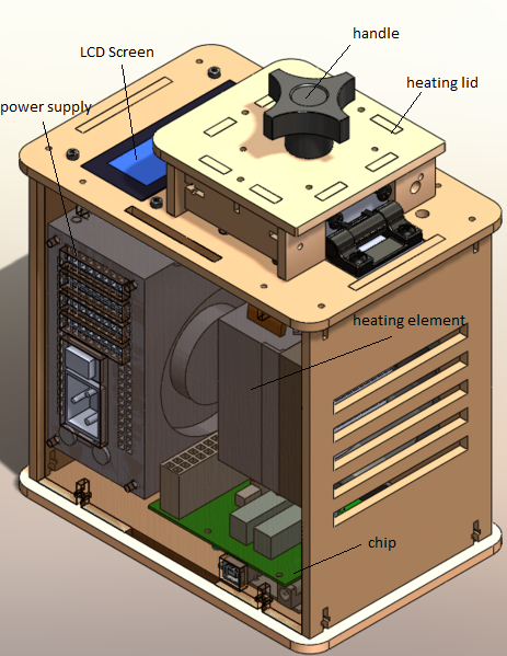 The PCR machine consists of a wooden box containing a heating element, power supply, and fan. On top of the box is the heating lid with handle. When the lid is lifted, slots for reaction tubes can be accessed. The LCD screen displays the current temperature, number of cycles completed, and estimated time remaining. The PCR machine is connected to a computer via USB. Once connected, Open PCR software is used to det the heating and cycling parameters. The computer monitor displays the same information as the LCD screen and gives an option to stop the experiment.