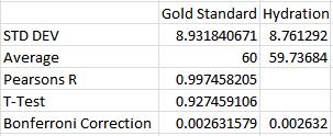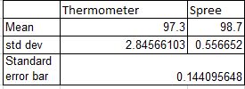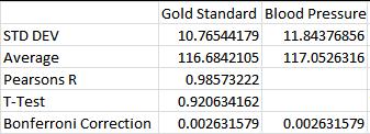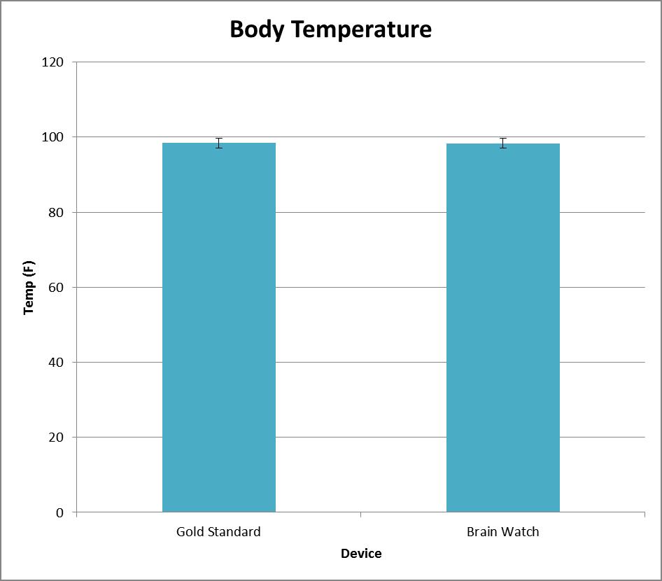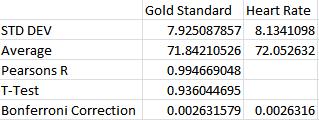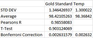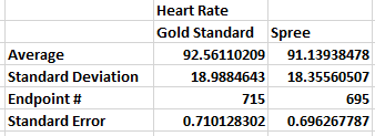 ResultsThe experiment showed that the mean of the pulse ox was similar to the mean beats per minute of Spree which were 94.8 and 94.6 bpm, respectively. These values yielded a T-Test value of near 0. Additionally, the correlation coefficient between the gold standard and the Spree temperature was almost nonexistent, at -.07. AnalysisJudging by the Pearson's R test between the actual temperature and the temperature the Spree recorded, which was -.07, we can infer that there is virtually no correlation between the temperature recorded by the Spree and the temperature recorded by the thermometer. Since the thermometer is accepted as a gold standard for measuring temperature, it is clear the the Spree is very poor at accurately measuring temperature. With regards to the T-test, we see that there is clearly no statistical difference between the means of the heart rate measurements, which is one thing that the Spree does well. Overall, however, the data shows that there are major flaws in the device's measurement, with regard to accuracy and reliability. The one aspect the device tries to market is not nearly as impressive as it claims.
