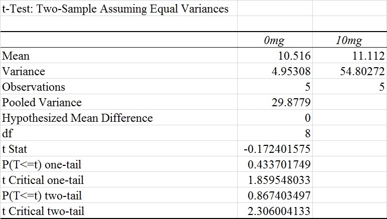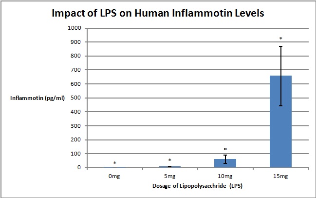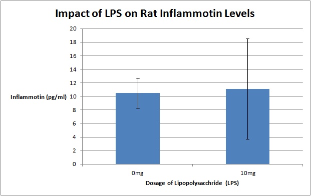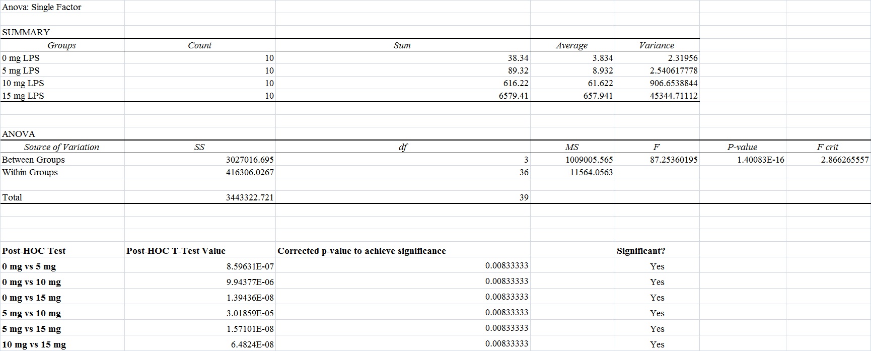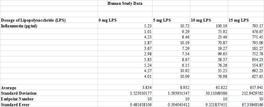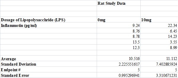 Summary/DiscussionDuring the research team's study, four groups of ten human subjects each were given various doses of LPS, with one group given a placebo. An analysis of variance, or ANOVA, was necessary to collect the data, since there were more than two experimental variables (groups) to account for. The information the ANOVA provided showed that a significant difference between the groups' inflammotin levels was apparent. As the dosage of LPS increased, the protein levels elevated more rapidly as well. This trend discovered maintained consistency throughout the four groups. Two groups of ten laboratory mice each were also formed for the experiment. One group of rats was given 10 mg of LPS, while the other served as a control group, receiving a placebo instead. A T-Test was necessary for data analysis, since only two groups of mice were required for the study. The data from the T-Test conducted showed that there was no apparent statistical difference between the groups' inflammotin levels when treatment was administered. The T-Test's p-value of 0.867403497 surpassed the standard alpha value of 0.05 for the study, serving as a basis for this conclusion. The now apparent difference between the human and rat groups may be for several reasons. The data collected from the human groups have the benefit of working with more subjects. Four groups of subjects compared to two groups could suggest a disparity between the conclusions made. Another possible cause could be the anatomical differences between humans and mice and how each species tolerates LPS drug consumption. The research team questions whether the environments the groups were exposed to may also have been a possible cause for statistical difference. How comfortable and conformed each subject was to the experimental atmosphere could suggest that stress may have been a factor for the study. | ||||||