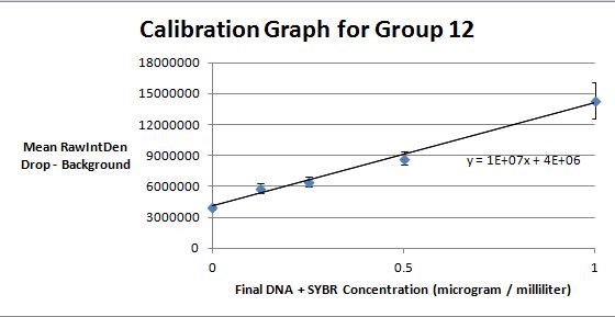 | Initial Concentration of 2X DNA solution (micrograms / mL) | Volume of 2X DNA solution (microliters) | Volume of SYBR Green I Dye (microliters) | Final DNA concentration in green dye (micrograms / mL) |