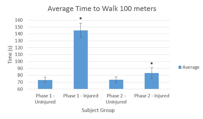Device DesignInferential StatisticsFor a 2 phase study consisting of uninjured and injured subjects, the differences in times for walking 100 m were recorded. Both groups wore the device during each phase. A p-value of .05 was required to indicate statistical significance. Comparing injured group in Phase 1 to same group in Phase 2: T-test p-value: 3.17E-28 Comparing uninjured group in Phase 1 to same group in Phase 2: T-test p-value: 0.840