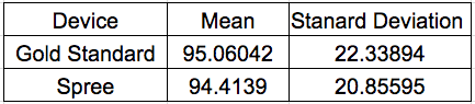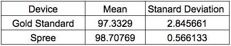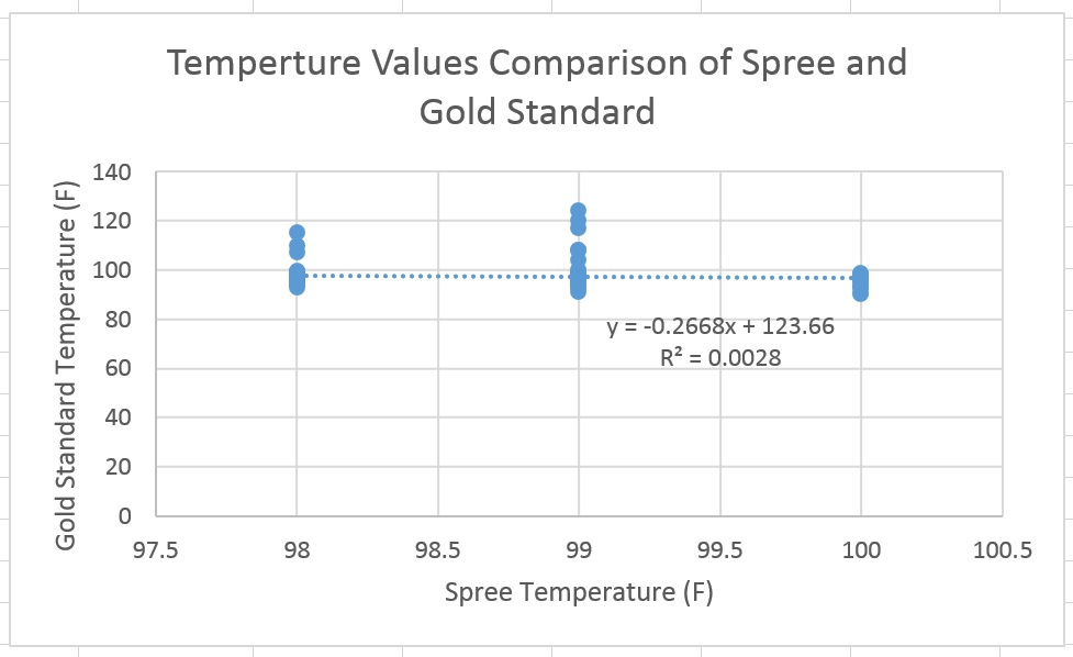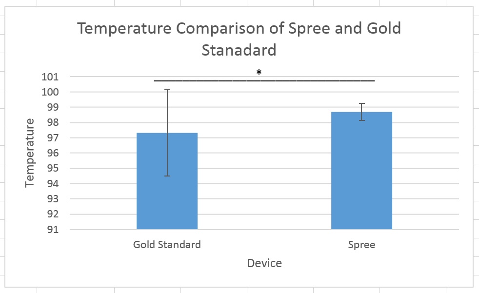 AnalysisHeart Rate Temperature Summary/DiscussionBased on the t-test value for temperature, there is a statistically significant difference between the Spree headband readings and the oral thermometer readings. The value after conducting the t-test was 8.5316E-20 which is less than the p-value of 4.97E-19. When examining heart rate, there is also a statistically significant difference between the Spree headband readings and the pulse oximeter readings. The value after conducting the t-test was 0.70208371 which is less than the p-value of 0.702084461. To improve the data gathered more intensive exercise could have been performed giving a larger range of data to compare and test. Another flaw observed when collecting data occurred was the spree would occasional disconnect producing no results to test. There is no real fix to this problem other than running more tests. Some improvements for the Spree headband could be to include a switch to turn the device on and off so that it does not turn off while in use and including an actual temperature instead of a color and number scale. The headband could also be improved by providing a better way to sync the phone app to the headband.