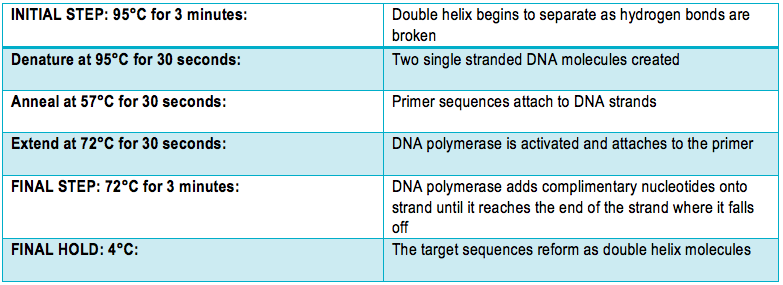 Base pairing occurs in the anneal step and final step of the thermal cycling. In the anneal step at 57°C for 30 seconds, the primer is pairing with the DNA strand. In the final step at 72°C for 3 minutes, the DNA polymerase is paring nucleotides to complete the DNA strand.