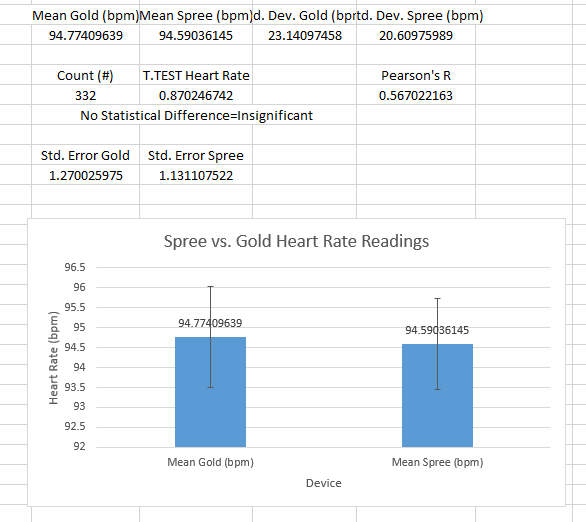 ResultsOur team used the T-Test to investigate the differences between the two groups; temperature and heart rate. The mean of the temperature for all 390 data was 1.5 degrees higher for the Spree than for the thermometer. The standard deviation for the thermometer was 2.3 higher than the Spree. The standard error for the thermometer was 0.115 higher than the Spree. The temperature T-Test was a number way smaller than the 0.05 p-value we use to compare the two. The Pearson's R for temperature was a -0.053. The mean of the heart rate for all 332 data was only 0.18 beats per minute (bpm) higher in the pulse oximeter than in the Spree. The standard deviation of the pulse oximeter was about 2.5 bpm higher than in the Spree device. The standard error for the pulse oximeter was 0.14 higher than the Spree. The heart rate T-Test was slightly bigger than the 0.05 p-value. The Pearson's R for hear rate was 0.57.
