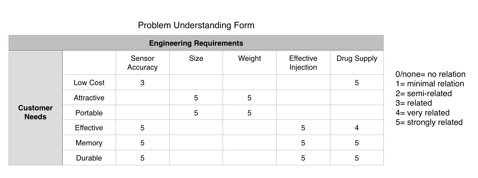 -sensor accuracy is important because the device must be able to accurately measure brain waves -size and weight are important because it is strongly correlated to the customer needs of something being attractive -effective injection is very important to the health of the customer, as to not under or overdose -drug supply is important because without the drug the device is obsolete