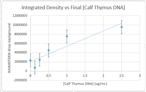 | Final DNA concentration in SYBR Green I solution (µg/mL) | Area | Mean Pixel Value | RAWINTDEN OF THE DROP | RAWINTDEN OF THE BACKGROUND | RAWINTDEN DROP - BACKGROUND |