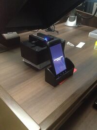 3. Place the phone on the cradle as close to a 90 deg angle as possible from the slide so that it takes a picture of the SYBR GREEN/Calf Thymus DNA solution drop sideways. You may need to raise the fluorimeter using the plastic trays provided in order to make sure the camera is sideways to the drop. This will allow ImageJ to filter the blue light easier.