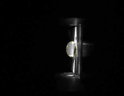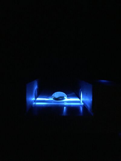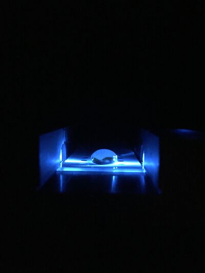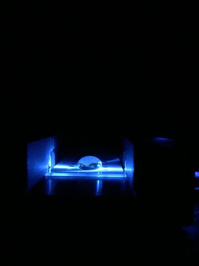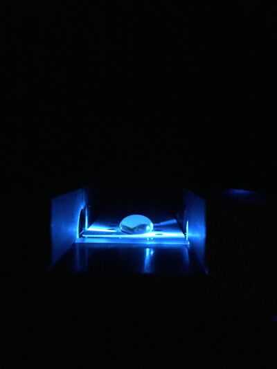 Adjust the slide so that the drop focuses the blue LED light to the middle of the black fiber optic fitting on the other side of the drop