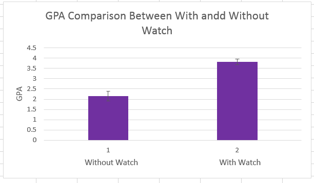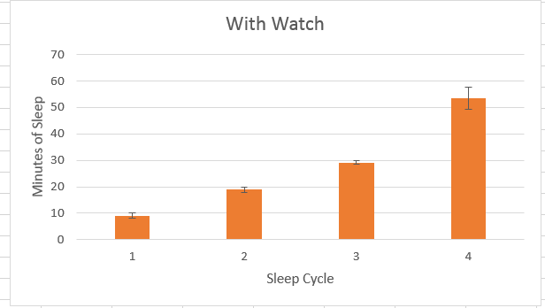Inferential Statistics100 college studens were tested. 50 with the watch. 50 without the watch. Both groups came in with poor amounts of sleep and a GPA average between 1.5 to 2.5 (similar to the results of the people who did not wear the Lotta-Rest sleeping watch). These are the average results of each group after an entire semester of observation. Sleep stages: without the watch- Average: 1- 6.655 minutes, 2- 13.295 minutes, 3- 20.295 minutes, 4- 30.355 minutes Standard Deviation: 1- 1.37438, 2- 2.82684, 3- 2.82684, 4- 4.5433 Sleep stages: with the watch- Average: 1- 9.035 minutes, 2- 18.88 minutes, 3- 29.13 minutes, 4- 53.57 minutes Standard Deviation: 1- 0.99856, 2- 0.87756, 3- 0.7027, 4- 4.12363 T-test between cycles: 1- 2.464E-07, 2- 3.059E-10, 3- 3.83E-16, 4- 2.768E-19 Since each value of the t-tests are all lower than 0.05, the amount of sleep is different depending on whether the subject wears the watch. Grade Point Average: Without Watch: Average: 2.15, Standard Deviation: 0.247243 With Watch: Average: 3.83, Standard Deviation: 0.13409 T-test: 3.4253E-26 The t-test value shows that the GPA between the two groups are different. It appears from this data that the Lotta-Rest sleeping watch does in fact improve sleep and grades.