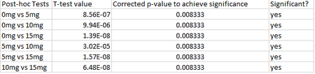 Summary/DiscussionThe data from both experiments show that the lipopolysaccharide significantly effected Inflammatin protein levels in humans but not rats. Furthermore, the p-values of the rat experiment show that the protein levels stayed the same between the 0mg and 10mg trials and no further experimentation was needed. On the other hand, the p-values from the human experiment show that the different dosages of lipopolysaccharide cause significant changes in human Inflammatin protein levels. We used post hoc tests to further compare the data from the ANOVA test, and we divided the original alpha value - 0.05 - by a value of six to account for the six comparisons (t tests) that we made. For Kirsten, we would advise her to use a more humanoid species for further experimentation such as apes. |